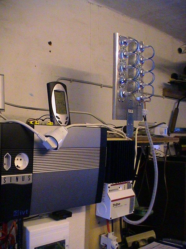 1. Bei 13,50 V wird ein Step Up Wandler zugeschaltet, der die Konstantladespannung für den zweiten Inselkreis von 13,80 V liefert. 2. Bei 13,90 V erfolgt die Zuschaltung der ersten Laststufe (Siehe EDIT unten) mit 50 W Halogenlampenlast, ein Zeitrelais wird aktiv und schaltet nach einer Zeit X den Wechselrichter ein. Parallel dazu könnte wahlweise die Netzeinspeisung aktiv werden. 3. Steigt die Systemspannung auf über 14 V, setzt der Tristarregler ein und reguliert mit der Pulsweitenmodulation eine Ersatzlast von 500 W. Diese besteht entgegen der Empfehlungen der Bedienungsanleitung aus 10 x 50 W Halogenlampen. 4. Sollte aus irgendwelchen Umständen die Spannung auf 14,35 V steigen, so schaltet sich eine Überwachungsstufe ein, die mit 300 W Last und anschließenden Kurzschluss auf die AC Seite den PWG 400 stoppen soll. Die automatische Rückstellung erfolgt nach ca. 2 Min. 5. Fällt dies System aus, so reagiert bei 14,45 V eine weitere, eigenständige Spannungsüberwachung, es erfolgt ein Kurzschluss auf der AC Seite des PWG 400 mit separaten Relais (Unabhängig von Punkt 4). Nach der Auslösung wird der Generator erst wieder freigegeben, wenn die Systemspannung unter 12,70 V fällt. Diese oberste Stufe hat noch eine weitere Funktion: Sollte die Spannung 15 V überschreiten, macht eine Schutzdiode die Überwachung stromlos, wodurch ein dauerhafter Kurzschluss auf den Generator erfolgt.