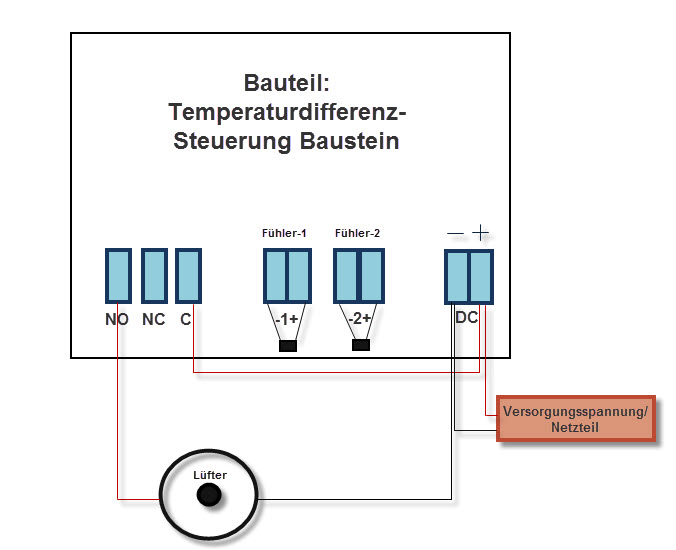 Vorher auch mal ein geringen Wert um generell die Schaltung einmal zu testen. Also so ca. 5°. Anschließend den Fühler einmal angehaucht um Wärme zu erzeugen. Das Bauteil schaltete anschließend und der Lüfter lief so lange, bis sich der Fühler wieder abgekühlt hatte. Den Fühler '2' habe ich direkt in den vorgesehenen Buchsen ( Im Bild = Fühler-2) direkt beim Bauteil befestigt.