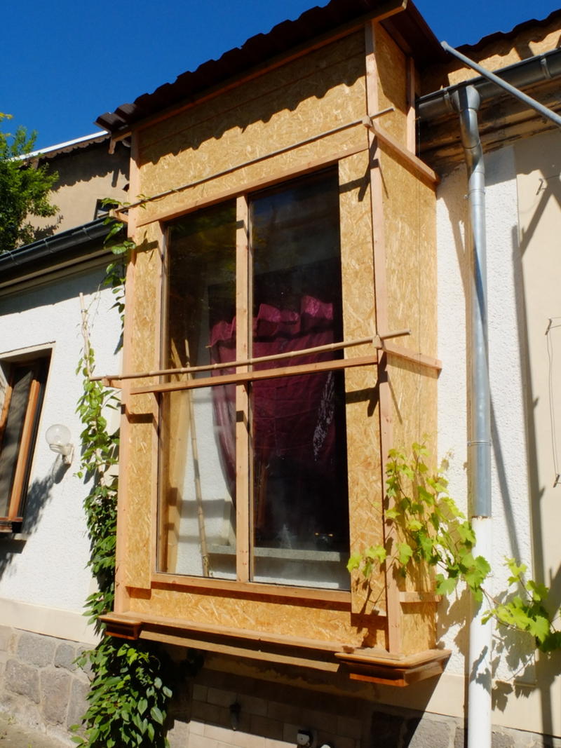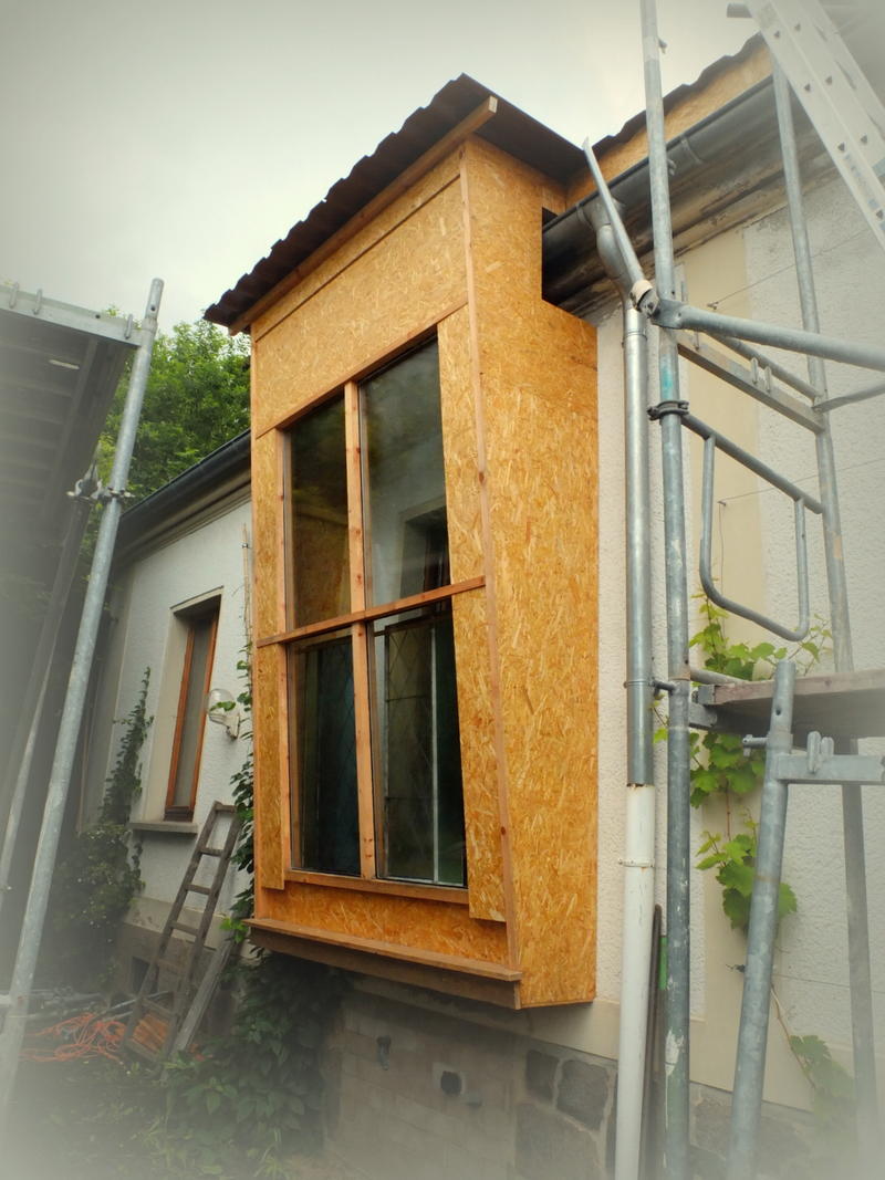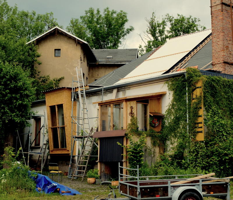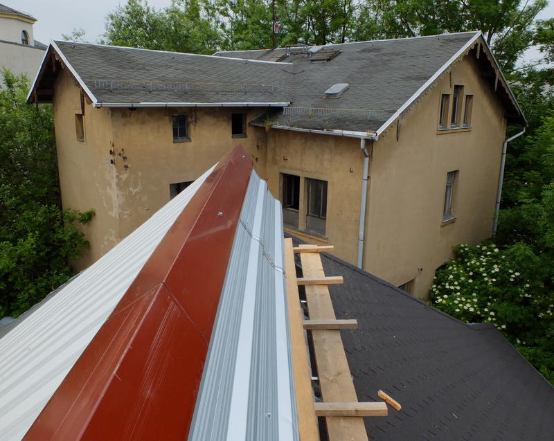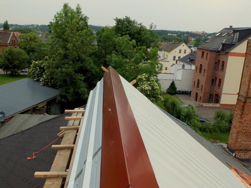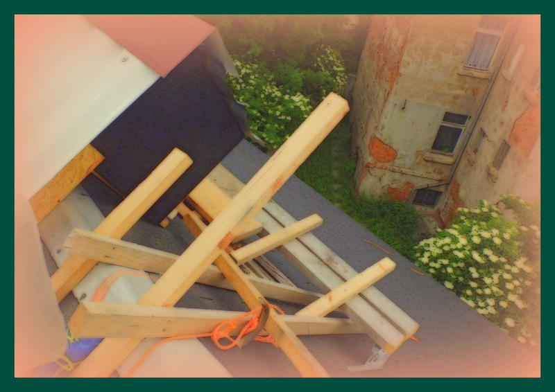 Ja, es geht vorwärts. Aber heute war wieder so ein Tag. Meine Tagesform war wie das Wetter. Ganz grau und dunkel startete der Tag und doch fiel kein Tropfen Regen. Und ich fühlte mich gar nicht wohl als Tagwandler am Firstkanal. Ist aber bald fertig. Mein Hirn funktionierte viel langsamer als wie wenn ich die gleichen Arbeitsgänge am Boden gemacht hätte. Es liefen so viele Programme, die sich um meine Sicherheit kümmerten, im Hintergrund, dass ich wie ein überlasteter Computer langsamer wurde. Ich stelle mir das gleich vor bei einem Extremkletterer: Die Balance zwischen Angst und Respekt vor den Gefahren finden. Ich mache es mir ja noch unnötig schwer: Das Stromkabel schlängelt sich sehr ähnlich wie meine "Sicherheitsseile" übers Dach. Auch die Natur macht mit. Unten am Aufzugsseil rankt sich schon die Kiwipflanze hoch. Beim Griff nach einem OSB Brett hatte ich ein Wespennest in der Hand!! Zum Glück trug ich Lederhandschuhe und die aufgestörten Wespen waren in keiner Weise agressiv, eher verdattert wie ich. Und auf dem Firstblech prangt schon der erste Vogeldreck...