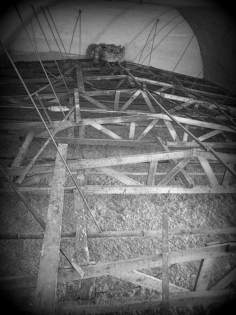 Hier sieht man die heruntergehängte Saaldecke, von mir mit Isofloc isoliert. Oben ist die ehemalige Tanzsaalgipskuppel zu sehen.
